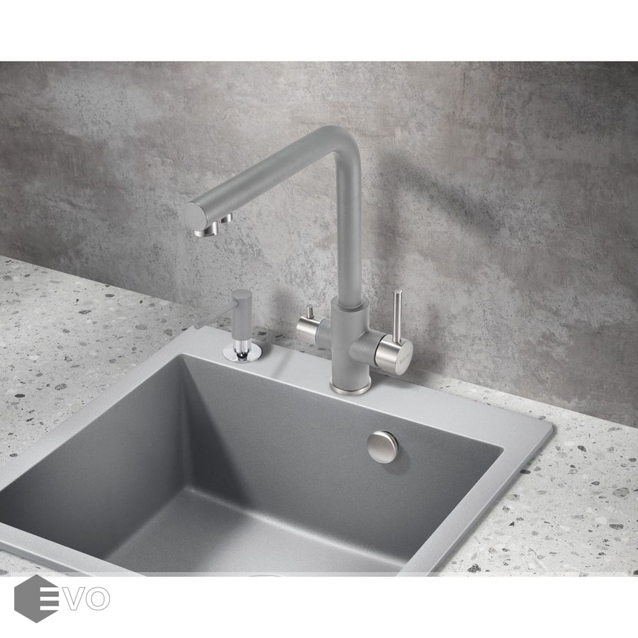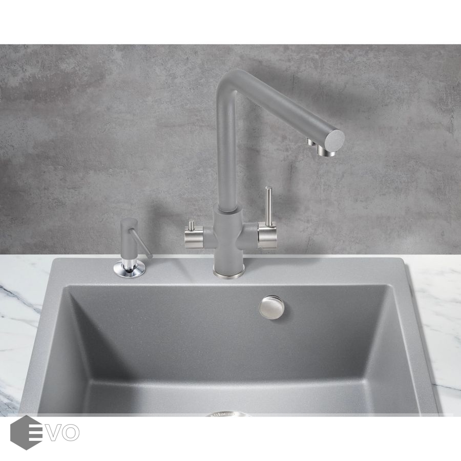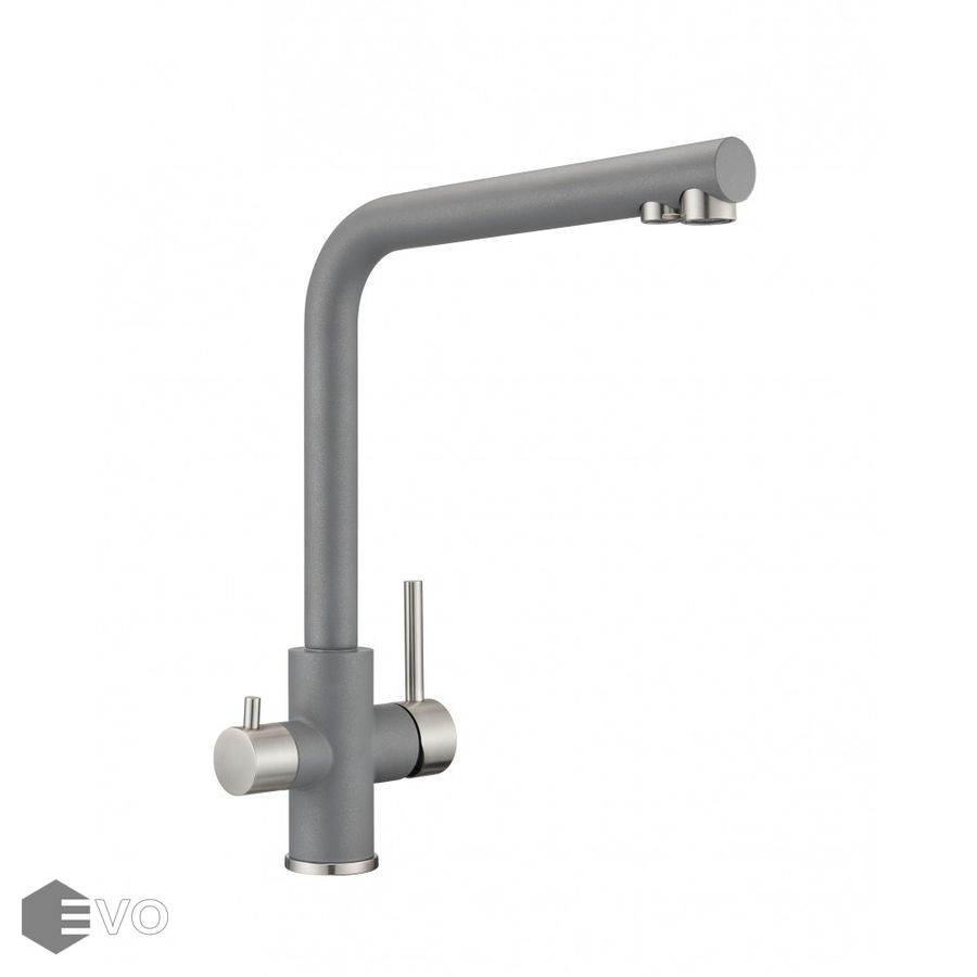 Один кран совмещает в себе две функции: подача воды для бытовых нужд + подача фильтрованной воды для питья. Два независимых друг от друга канала не только исключают возможность перекрестного смешивания воды, но и избавляют от необходимости устанавливать дополнительный кран для фильтра, что освобождает рабочее пространство и не перегружает общий вид кухни. Простая регулировка подачи обычной и питьевой воды осуществляется с помощью двух обособленных рычагов, установленных на одном корпусе (один рычаг — для бытовой воды, второй — для фильтрованной). Гибкая подводка идет в комплекте.