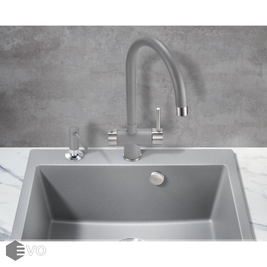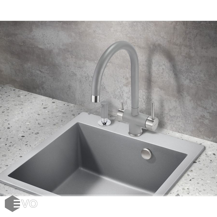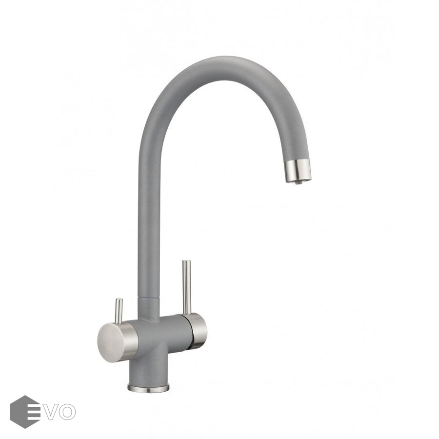 Смеситель для кухонной мойки Milacio Ultra (MCU.554.GR) из нержавеющей стали, с возможностью подключения фильтра — стильное и высокофункциональное решение, которое выгодно подчеркнет все достоинства вашей кухни. Модель выполнена в сером цвете с добавлением металлика и имеет изящный изогнутый кран, благодаря чему станет яркой, привлекающей внимание деталью на кухне и никого не оставит равнодушным.