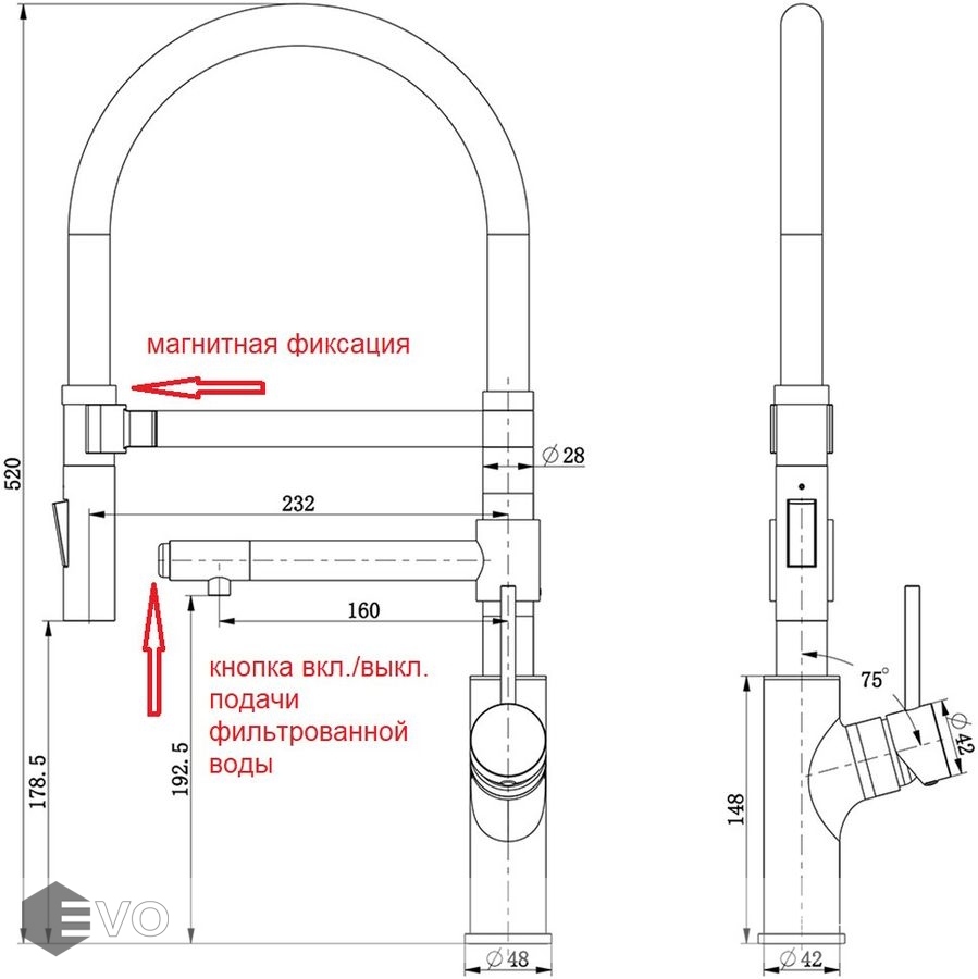 - Длина: излива: 232 мм