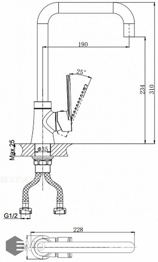 В смеситель установлен картридж D-35 с керамическими пластинами. Высота смесителя 310 мм. Излив поворотный 190 мм. Высота излива до аэратора 234 мм. Аэратор изготовлен из пластика с нержавеющим корпусом.