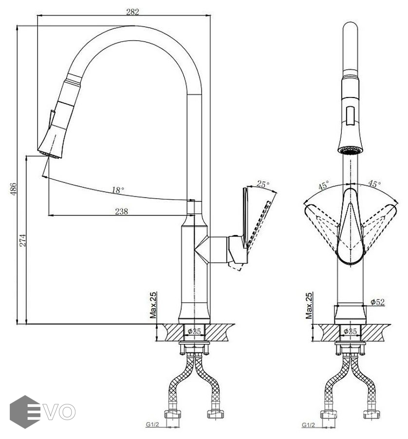 • Угол отведения рычага: 25°