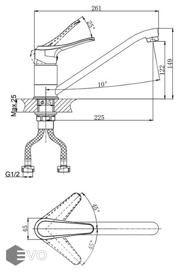 Высота смесителя 149 мм. Излив поворотный 225 мм. Высота излива до аэратора 122 мм. Аэратор изготовлен из пластика с нержавеющим корпусом, угол наклона - 10 гр.