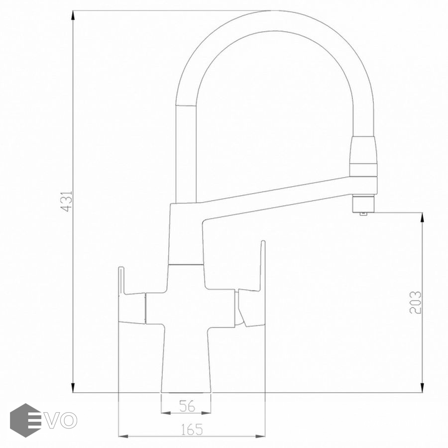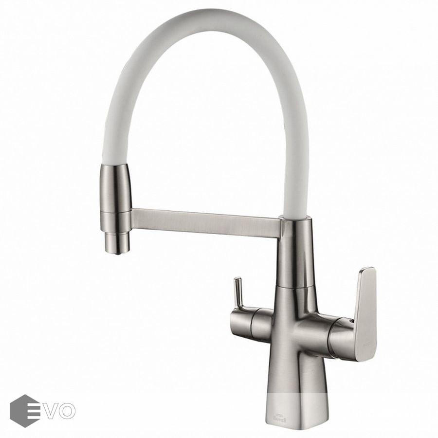 В смесителе применена технология "двойного канала", которая позволяет подключить питьевой фильтр сразу к смесителю. Вода подается не смешиваясь по разным каналам. Рукоятка управления водопроводной водой находится справа от носика, управление питьевой водой - слева.