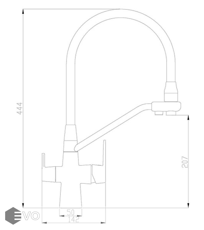 В смесителе применена технология "двойного канала", которая позволяет подключить питьевой фильтр сразу к смесителю. Вода подается не смешиваясь по разным каналам. Рукоятка управления водопроводной водой находится справа от носика, управление питьевой водой - слева.