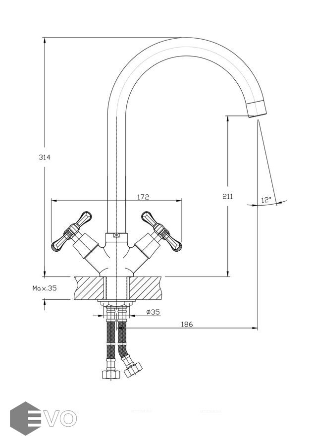 Высота смесителя 314 мм. Излив поворотный 186 мм. Высота излива до аэратора 211 мм. Аэратор изготовлен из пластика с нержавеющим корпусом, угол наклона - 12 гр.