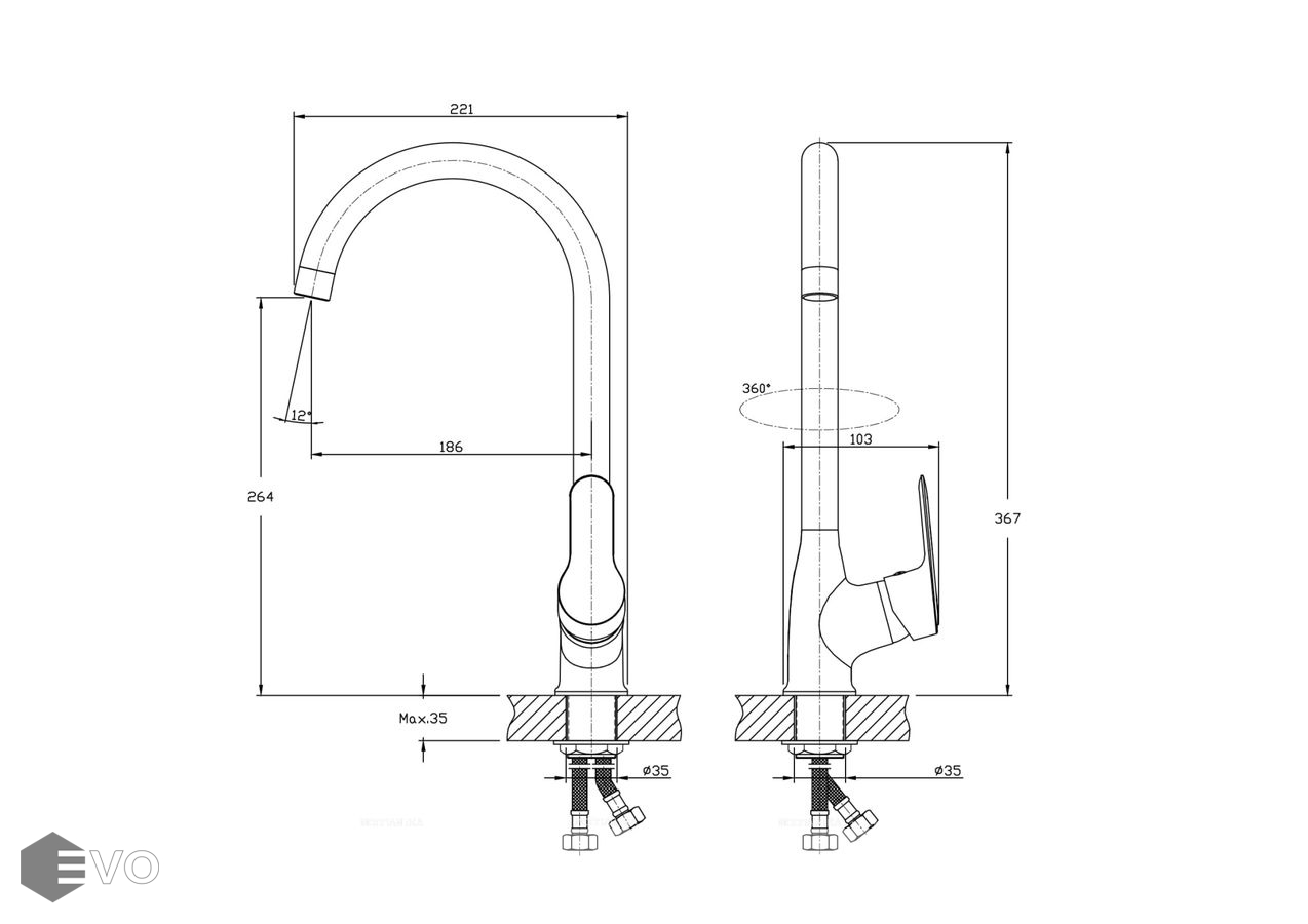 Высота смесителя 367 мм. Излив поворотный 360 гр, 186 мм. Высота излива до аэратора 264 мм. Аэратор изготовлен из пластика с нержавеющим корпусом, угол наклона аэратора -14 гр.