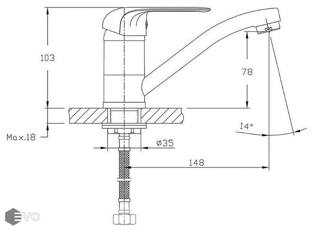 • Длина излива 148 мм