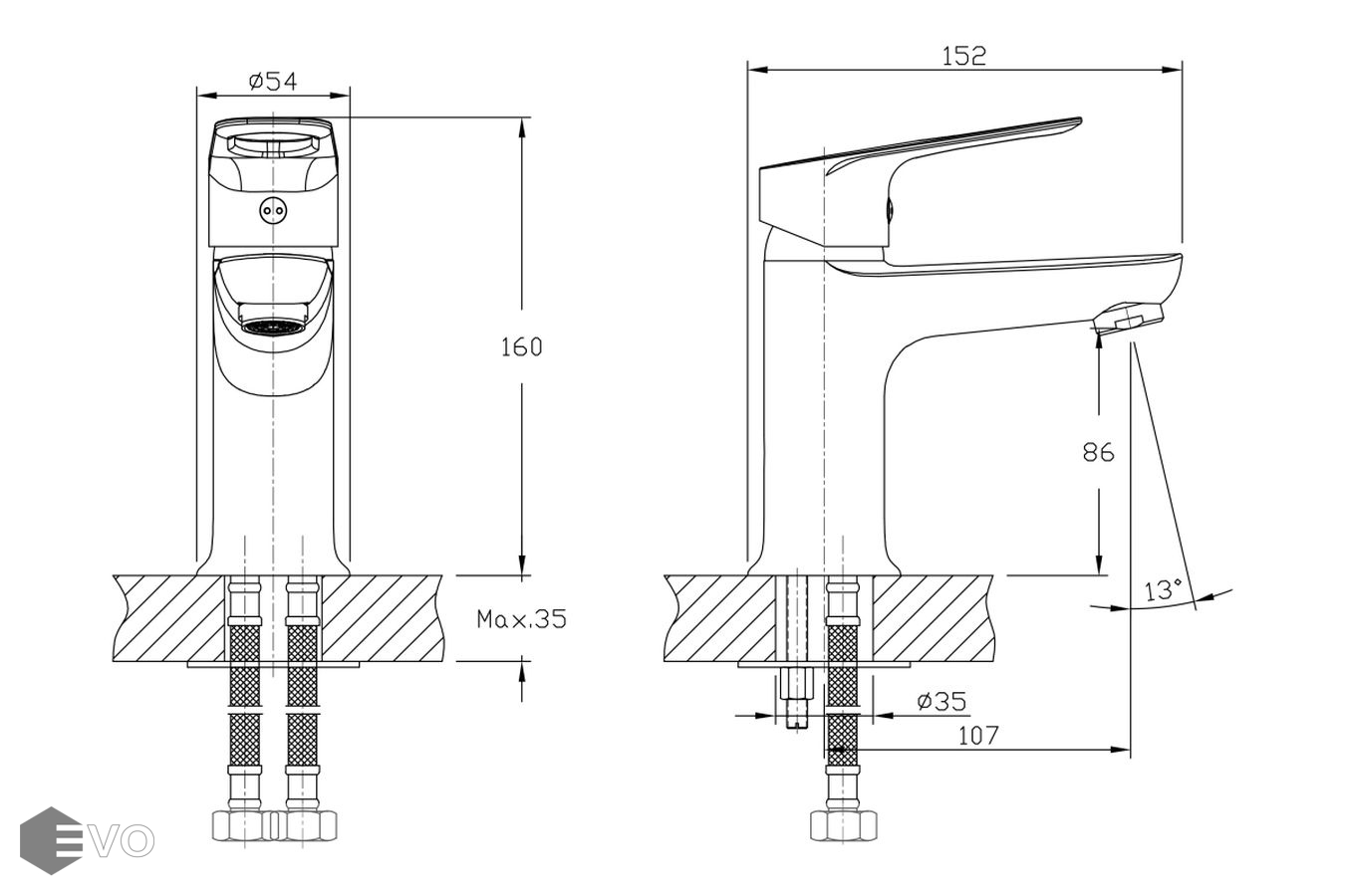 • Диаметр отверстия в раковине: 35 мм