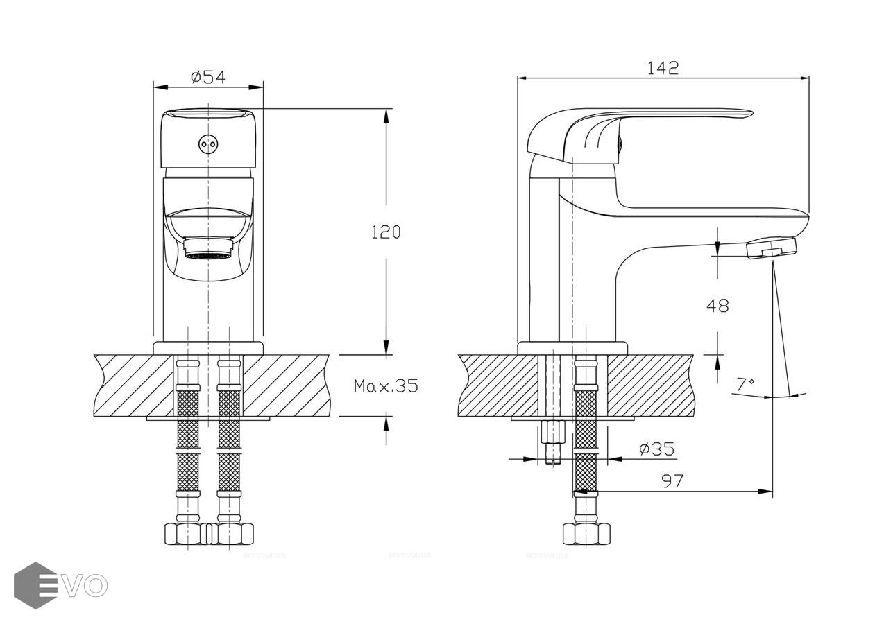 Высота смесителя 120 мм. Излив литой, неповоротный, 97 мм. Высота излива до аэратора 48 мм. Аэратор изготовлен из пластика с нержавеющим корпусом, угол наклона - 7 гр.