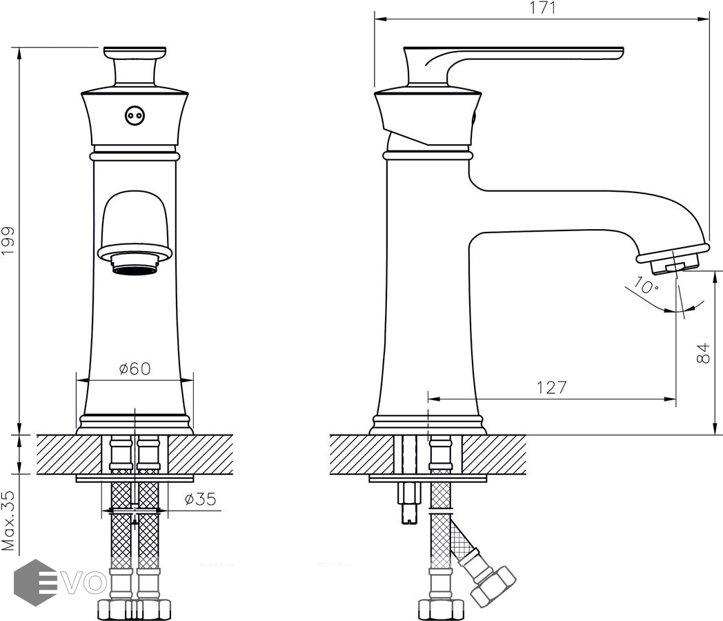 Высота смесителя 199 мм. Излив литой, неповоротный, 127 мм. Высота излива до аэратора 84 мм. Аэратор изготовлен из пластика с нержавеющим корпусом, угол наклона аэратора - 10 гр.