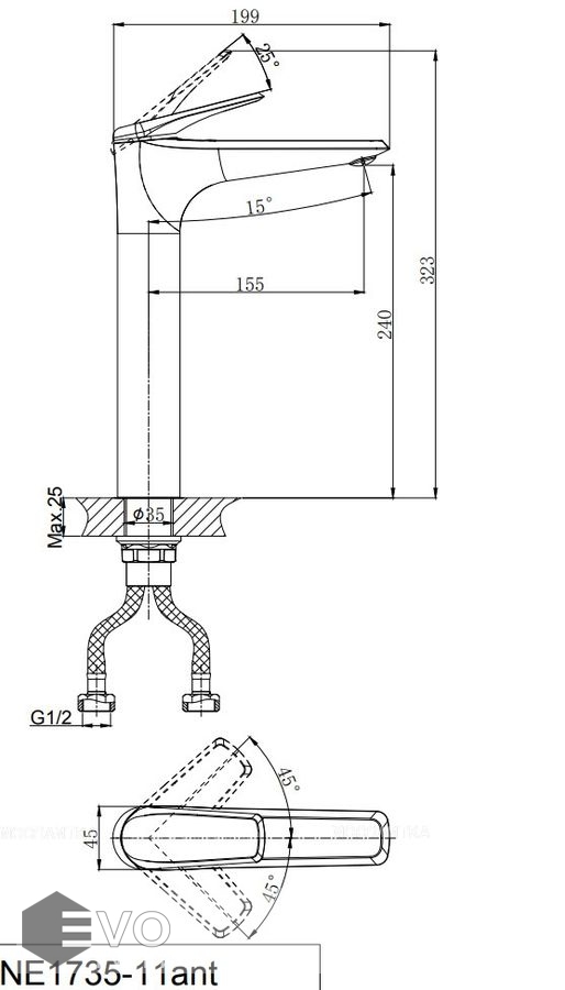 Высота смесителя 323 мм. Излив литой неповоротный 199 мм. Высота излива до аэратора 240 мм. Аэратор изготовлен из пластика с нержавеющим корпусом, угол наклона - 15 гр.