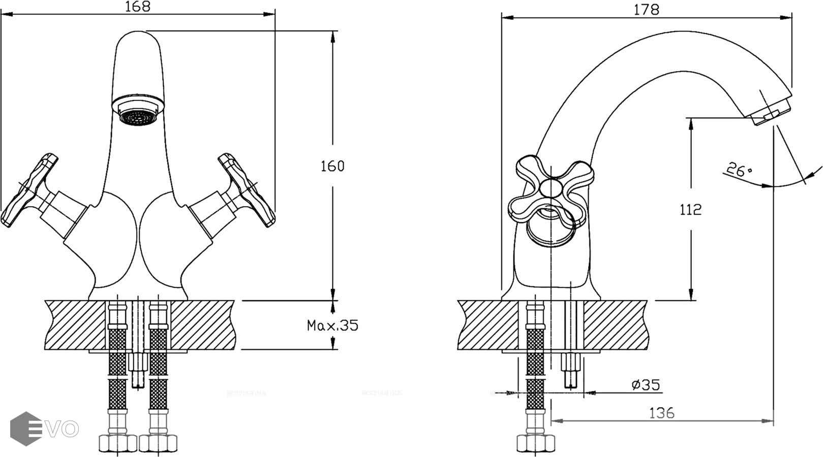 В смеситель установлены кран-буксы (RSH502) с керамическими пластинами. Высота смесителя 160 мм. Излив литой неповоротный 136 мм. Высота излива до аэратора 112 мм. Аэратор изготовлен из пластика с нержавеющим корпусом, угол наклона - 26 гр.