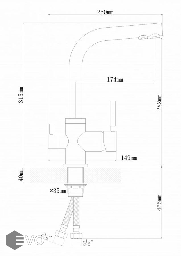 - Монтируется в отверстие кухонной мойки на шпильки. Диаметр d=35 мм