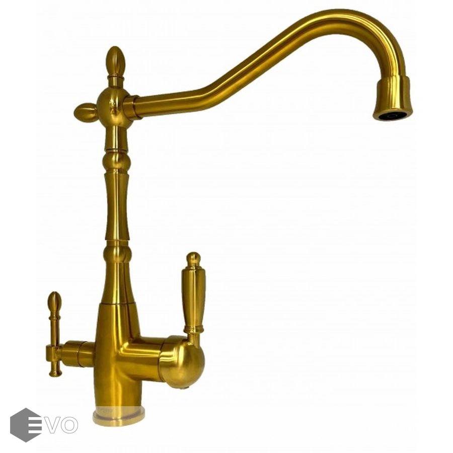 Смеситель TopZero Brad GOLD производства TopZero является высокотехнологичным оборудованием. Это винтажный кухонный смеситель с высоким поворотным изливом и подключением к фильтру для питьевой воды, обеспечивает не только смешивание и подачу горячей и холодной воды, но и подвод питьевой воды от фильтра через отдельный канал, и все это встроено в один корпус.