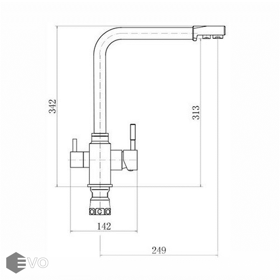Модель оснащена подключением к фильтру с питьевой водой и рычагом, обеспечивающим контроль и точность при выборе напора и температуры воды.