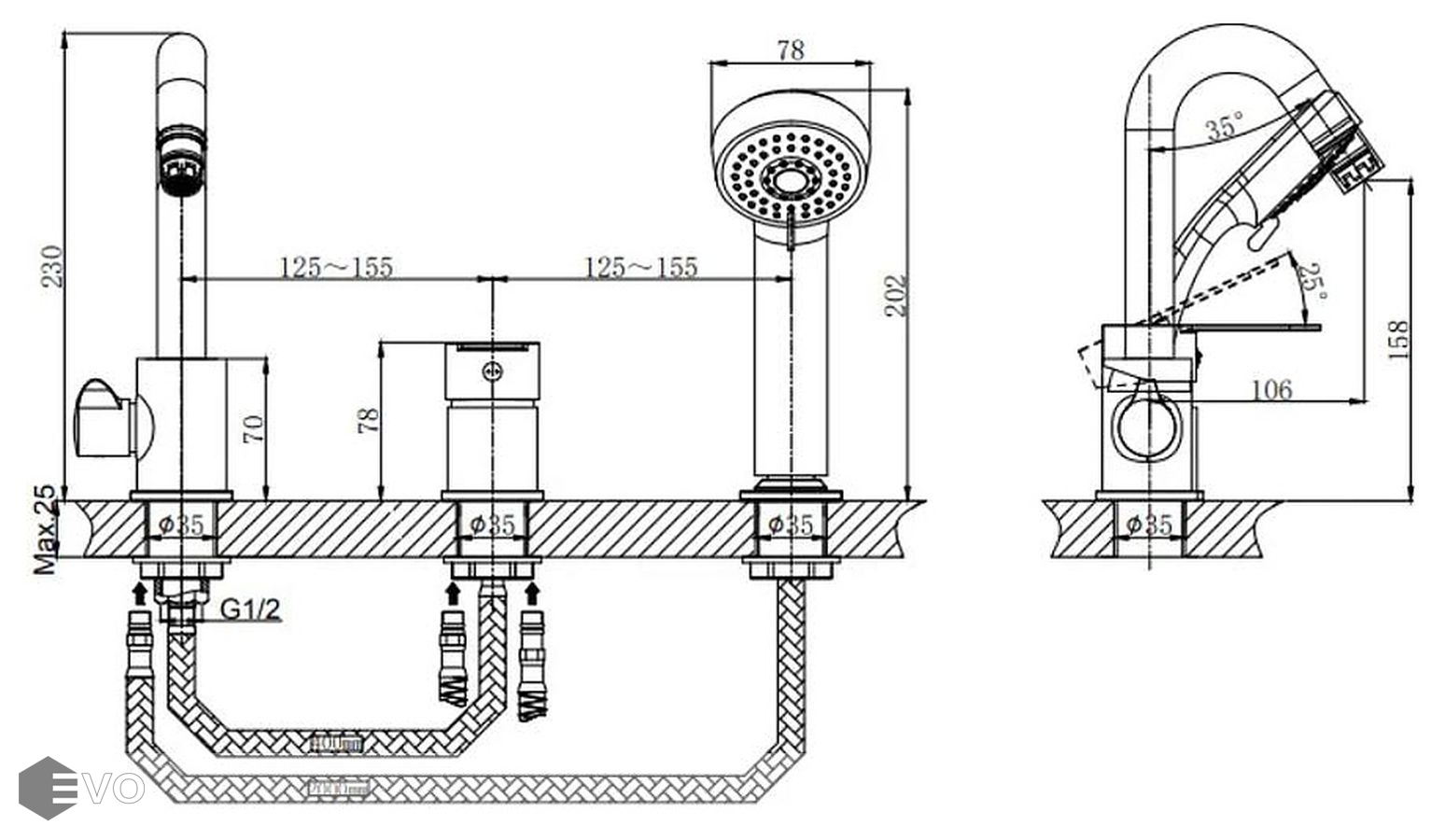 • Угол поднятия рычага: 25°