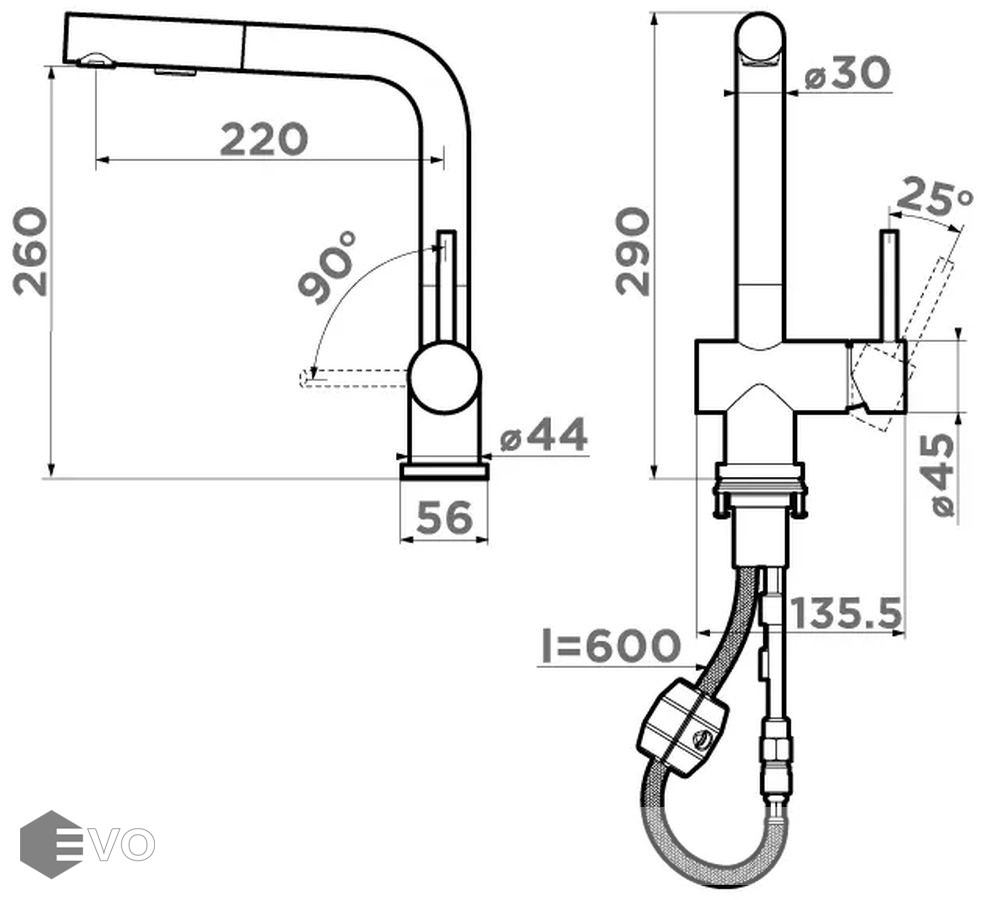 - Практичный однорычажный смеситель выполнен в современном стиле и снабжен высоким поворотным изливом и вытяжным шлангом;