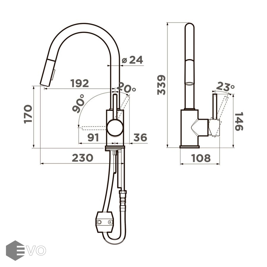 - Особенности: Вытяжной шланг длиной до 400 мм, кнопка струя/душ