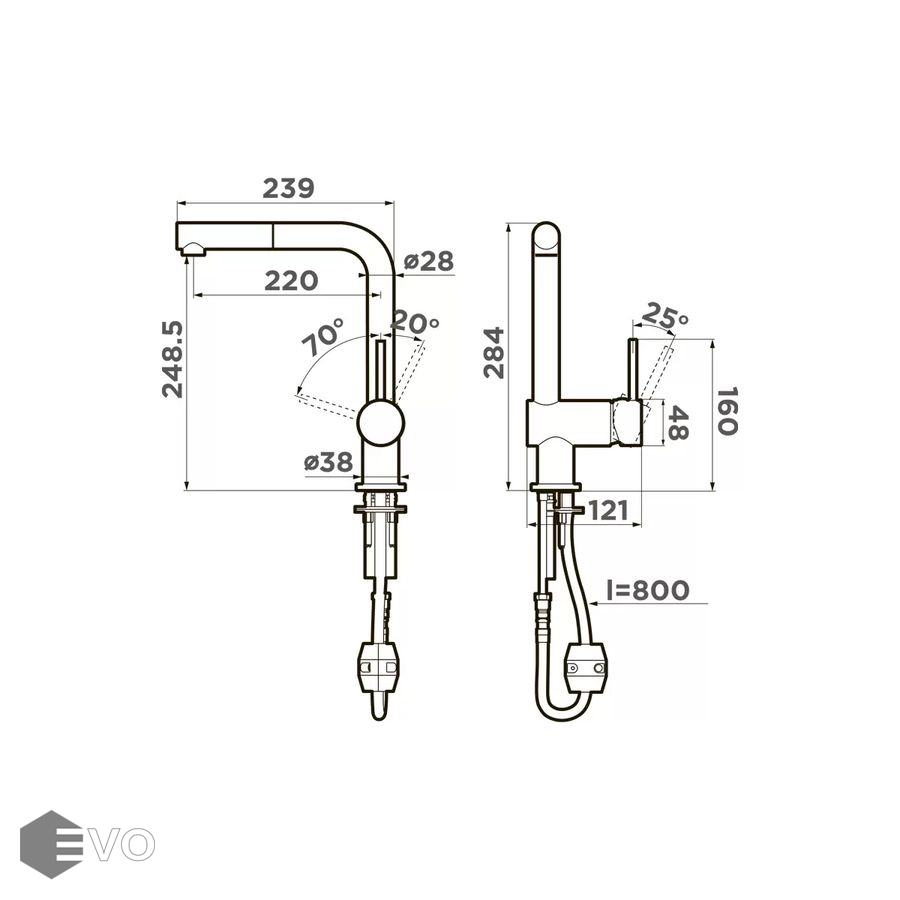 - Практичный однорычажный смеситель выполнен в современном стиле и снабжен высоким поворотным изливом и вытяжным шлангом;