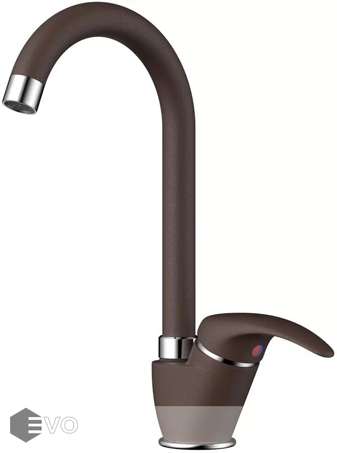 - Смеситель выполнен в современном стиле и снабжен высоким поворотным изливом, что гарантирует максимальное удобство на кухне;