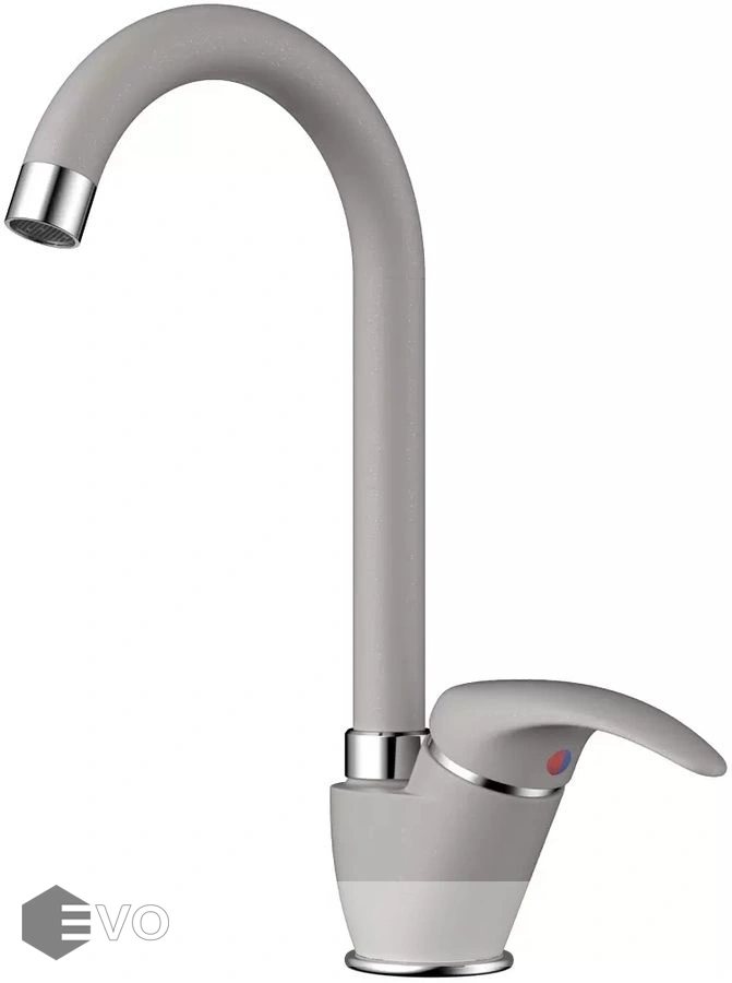 - Смеситель выполнен в современном стиле и снабжен высоким поворотным изливом, что гарантирует максимальное удобство на кухне;