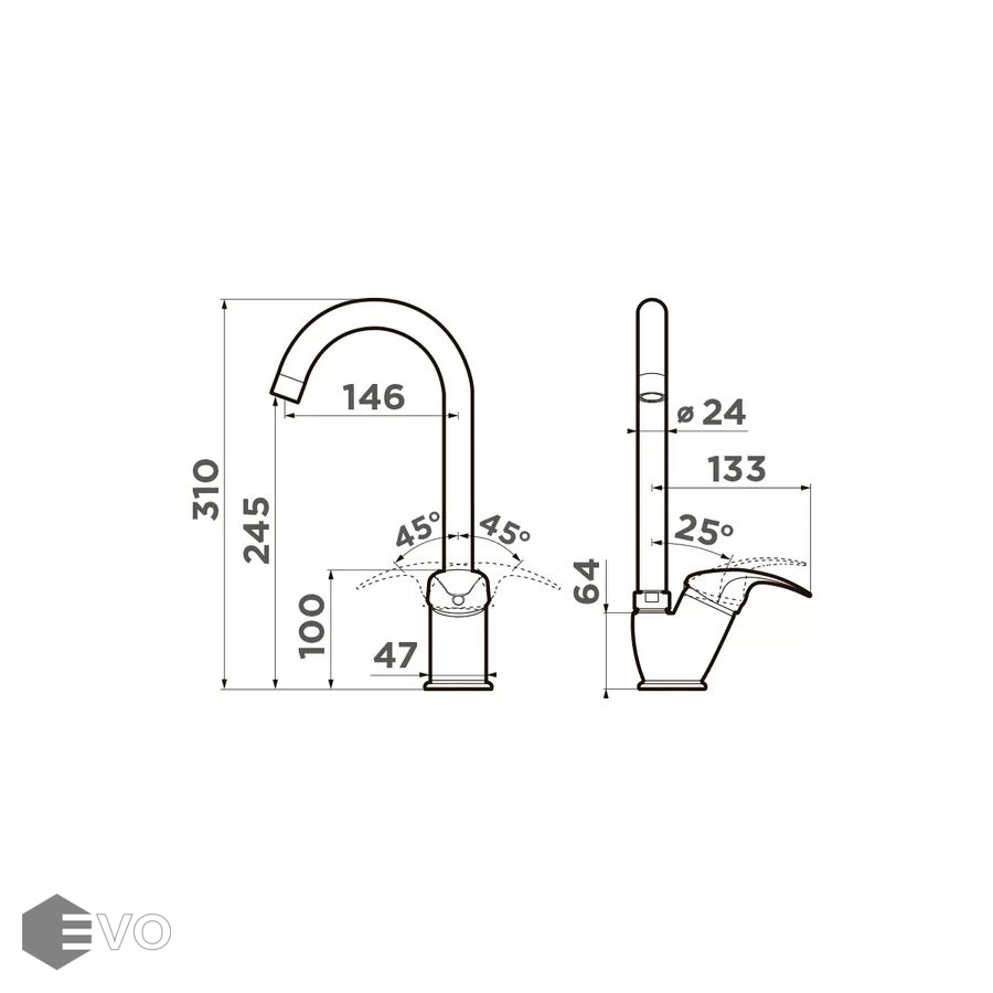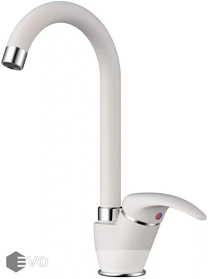 - Смеситель выполнен в современном стиле и снабжен высоким поворотным изливом, что гарантирует максимальное удобство на кухне;