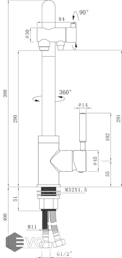 - Высота смесителя: 398 мм
