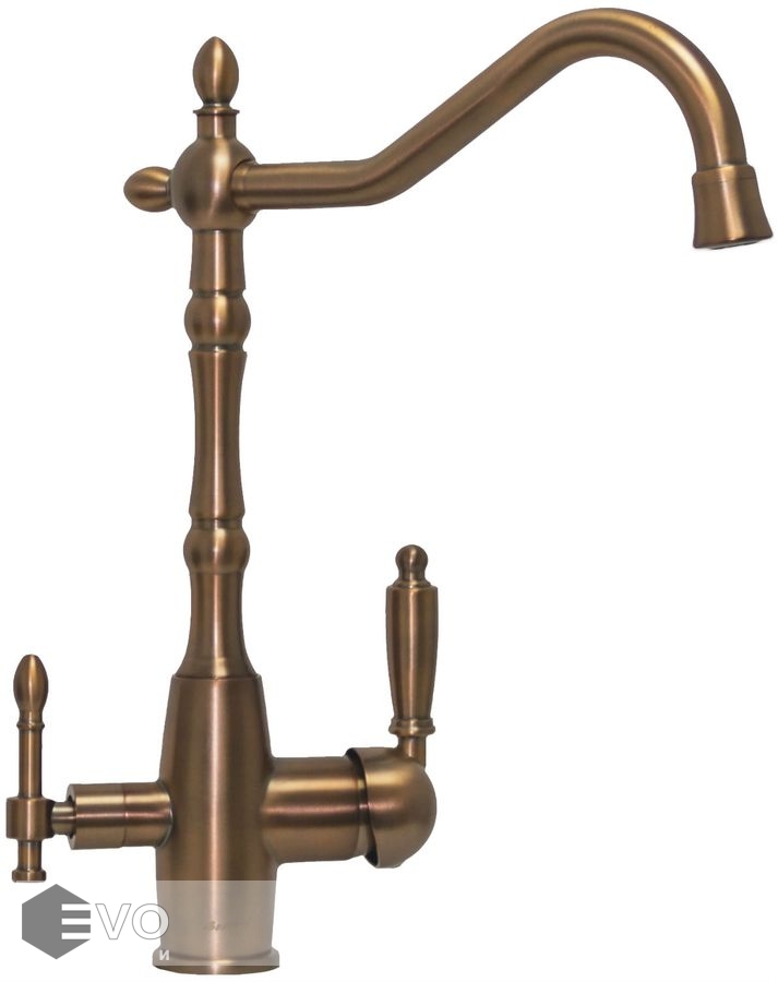 Смеситель Seaman Barcelone SSL-5387 Copper (PVD + patina) - кухонный смеситель со встроенным краном для питьевой воды, выполненный в ретро дизайне. Обладает длинным высоким изливом, который обеспечивает максимум удобства при промывке и наполнении габаритной посуды. Благодаря двухканальной технологии фильтрованная вода не смешивается с водопроводной. Для подачи фильтрованной воды имеется отдельный рычаг управления. Модель великолепно впишется в классическую кухню и привнесет в нее современную функциональность. Смеситель выполнен из высококачественной бессвинцовой латуни. Имеет устойчивую к царапинам и коррозии PVD-отделку.