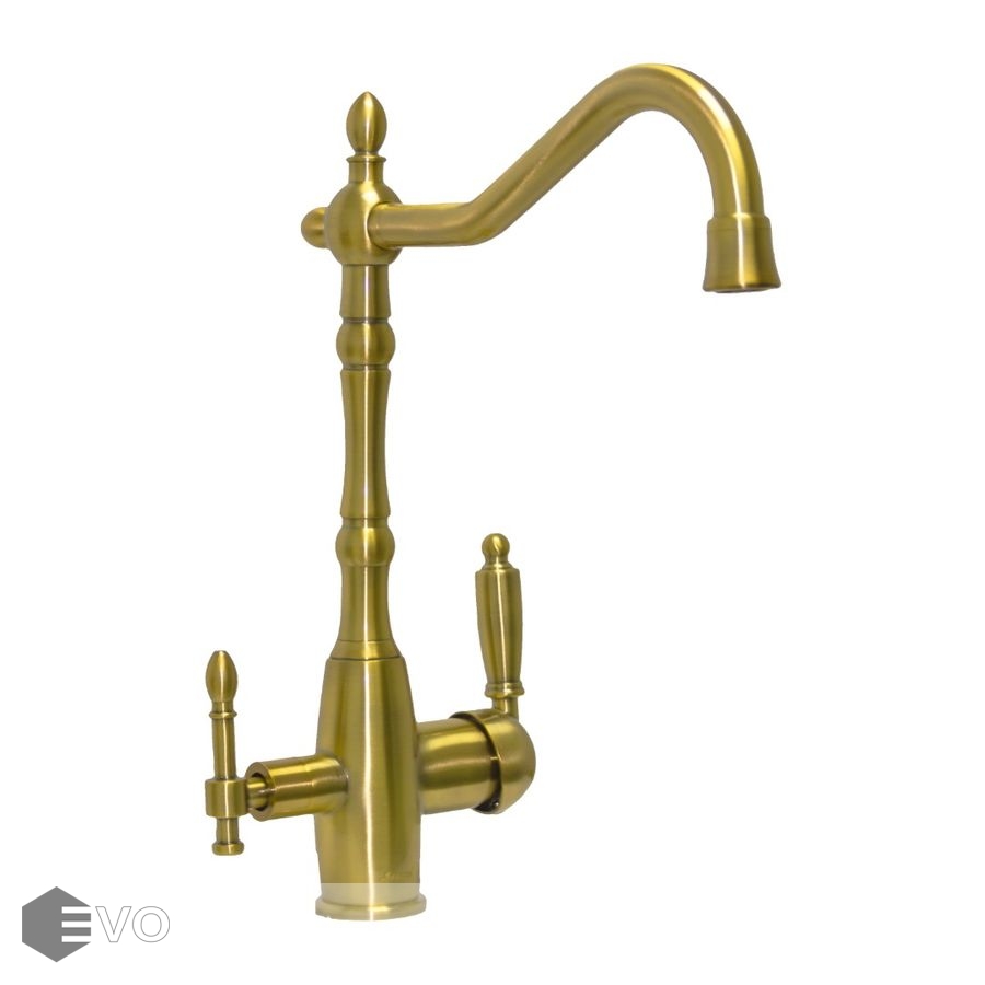 Смеситель Seaman Barcelone SSL-5387 Gold Satin (PVD) - кухонный смеситель со встроенным краном для питьевой воды, выполненный в ретро дизайне. Обладает длинным высоким изливом, который обеспечивает максимум удобства при промывке и наполнении габаритной посуды. Благодаря двухканальной технологии фильтрованная вода не смешивается с водопроводной. Для подачи фильтрованной воды имеется отдельный рычаг управления. Модель великолепно впишется в классическую кухню и привнесет в нее современную функциональность. Смеситель выполнен из высококачественной бессвинцовой латуни. Имеет устойчивую к царапинам и коррозии PVD-отделку цвета золота.
