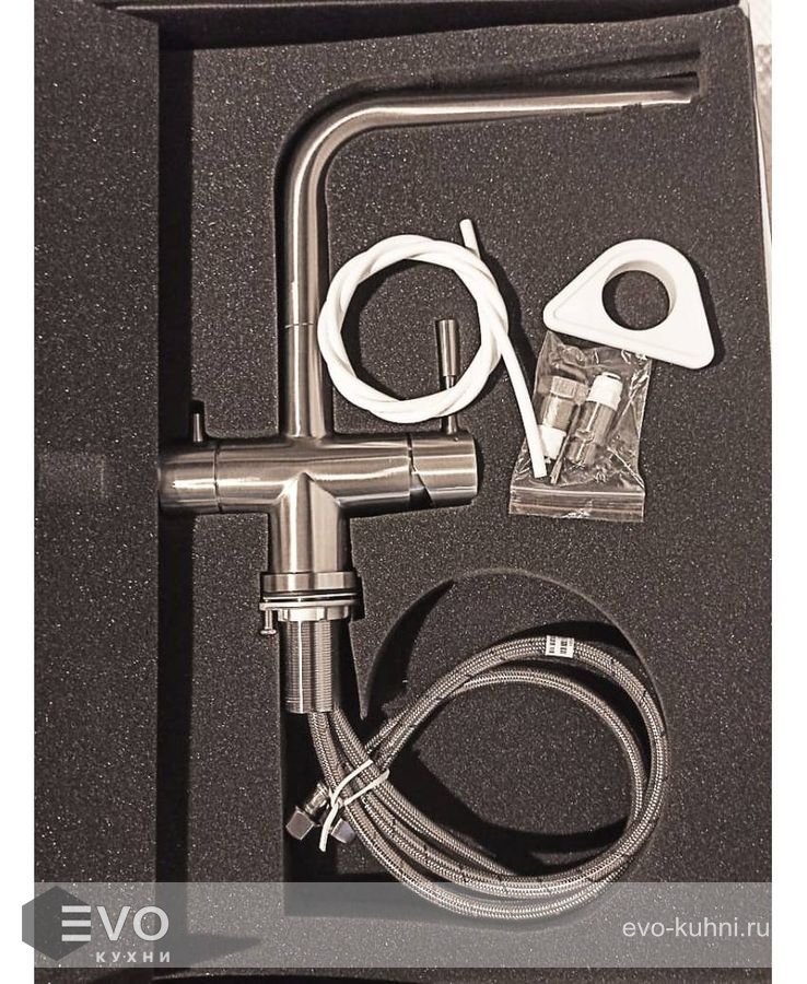 Смеситель поставляется в полной комплектации, необходимой для установки, подключения и эксплуатации (кроме фильтра для очистки воды). В комплект входят: гибкие соединительные шланги — 2 шт. цанга для подключения чистой воды. стабилизирующая пластина для установки на мойках из нержавеющей стали. комплект креплений. трубка 1/4" из пищевого пластика для подключения чистой питьевой воды.