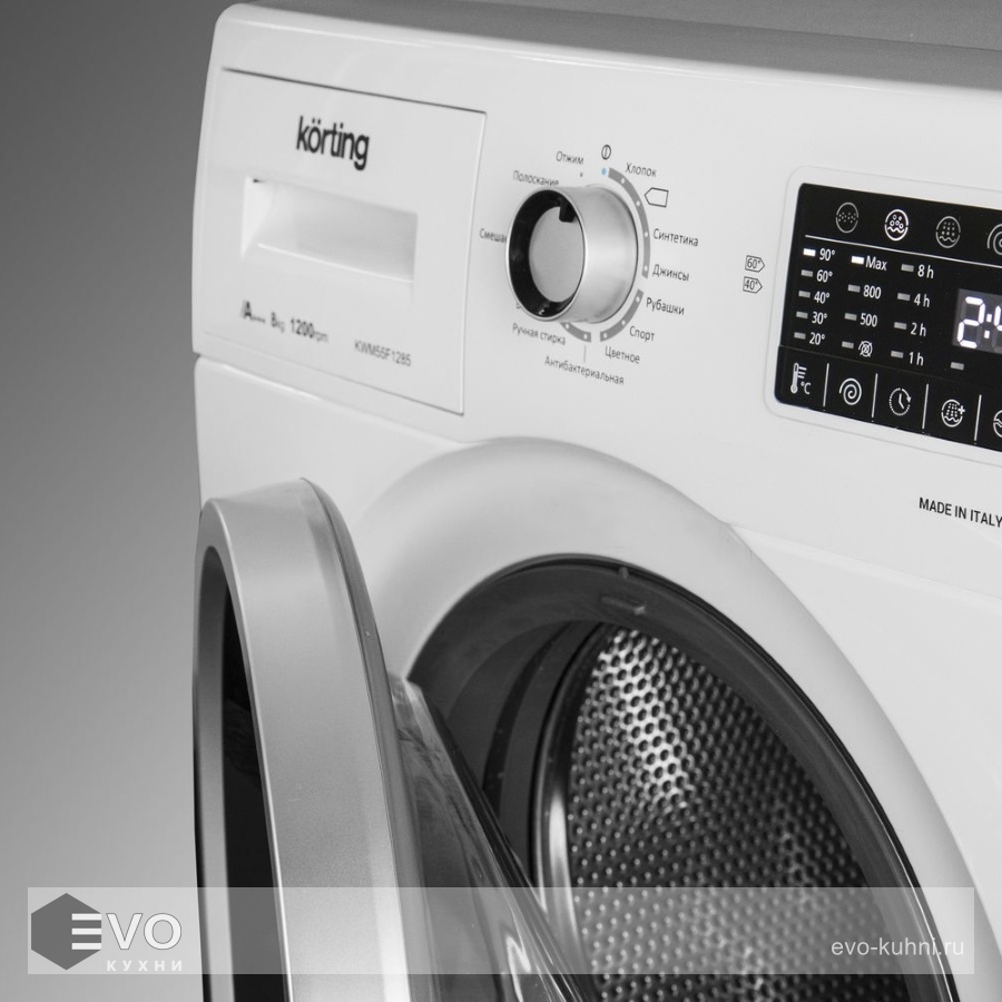 Стиральная машина Korting KWM 55F1285 с загрузкой 8 кг оснащена сенсорным дисплеем Touch Control с индикацией настроек и хода программ. Скорость отжима регулируется от 500 до 1200 оборотов, при необходимости опцию можно отключить.