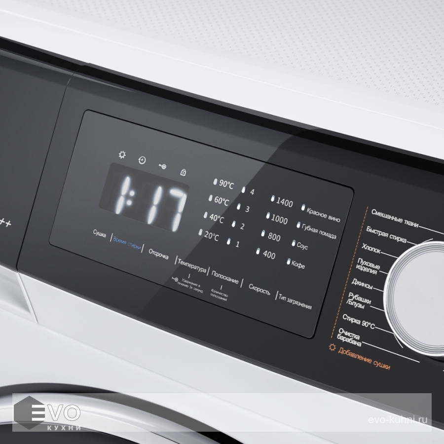 Предусмотрены следующие дополнительный функции для стирки: предварительная стирка, дополнительное, полоскание, легкая глажка, быстрая стирка, функция «Добавление», отложенный старт (0-24 часа), блокировку от детей, программа «Тип загрязнения».