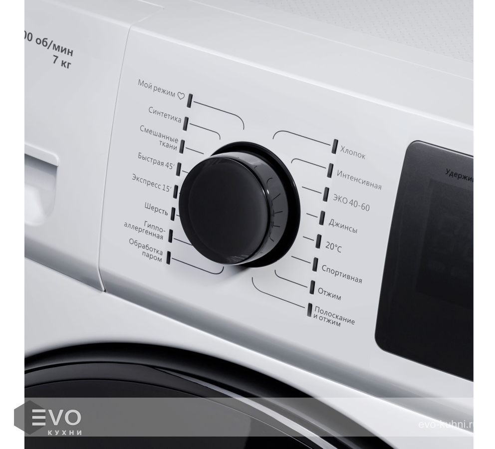 Электронное управление с LЕD дисплеем позволяет с легкостью включить один из 15 режимов стирки: синтетика, смешанные ткани, быстрая стирка 45 минут, экспресс 15 минут, шерсть, гипоаллергенная, полоскание и отжим, отжим, спортивная одежда, 20°C, джинсы, ЕСО 40-60°, интенсивная, хлопок, мой режим.
