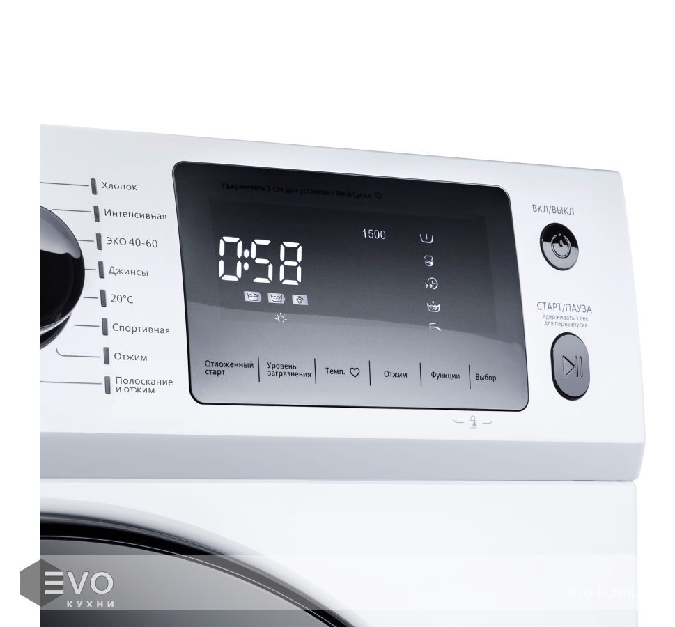 Предусмотрены дополнительный функции для стирки: предварительная стирка, дополнительная стирка, дополнительное полоскание, легкая глажка, быстрая стирка, функция "Пауза" позволяет остановить стирку и добавить белье, функция «Перезапуск», программа «Уровень загрязнения», отложенный старт (0-24 часа), блокировку от детей.