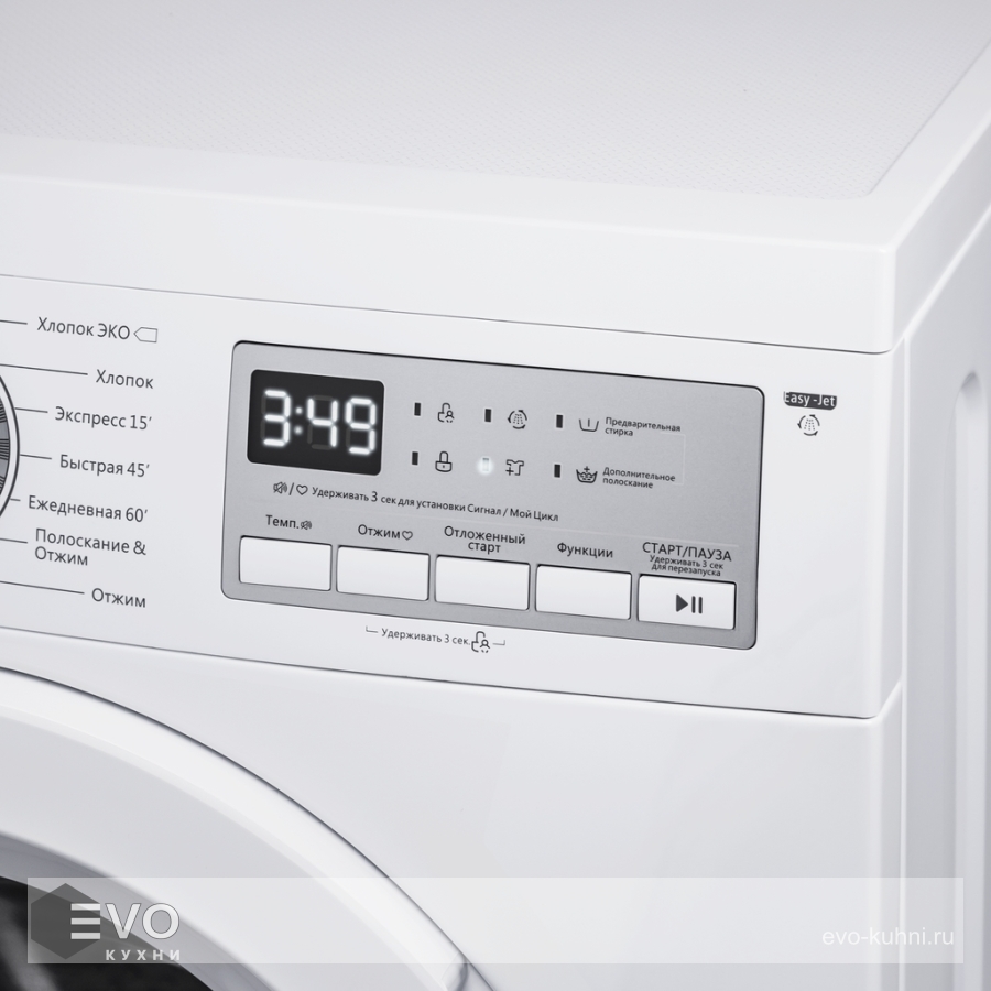 Электронное управление с LED дисплеем позволяет с легкостью включить один из 15 режимов стирки: предварительная стирка, дополнительное полоскание, быстрая стирка, мой цикл - данная функция применяется для запоминания часто используемой программы, по умолчанию данная программа настроена на программу Хлопок ЭКО, перезапуск, отключение зумера, дополнительное опрыскивание - манжета и внутренняя поверхность дверцы люка всегда остаются чистыми, благодаря автоматическому промыванию направленными струями воды, отложенный старт (0-24 часа)- вы сами можете выбирать время начала работы с отсрочкой от 0 до 24 часов, блокировку от детей.