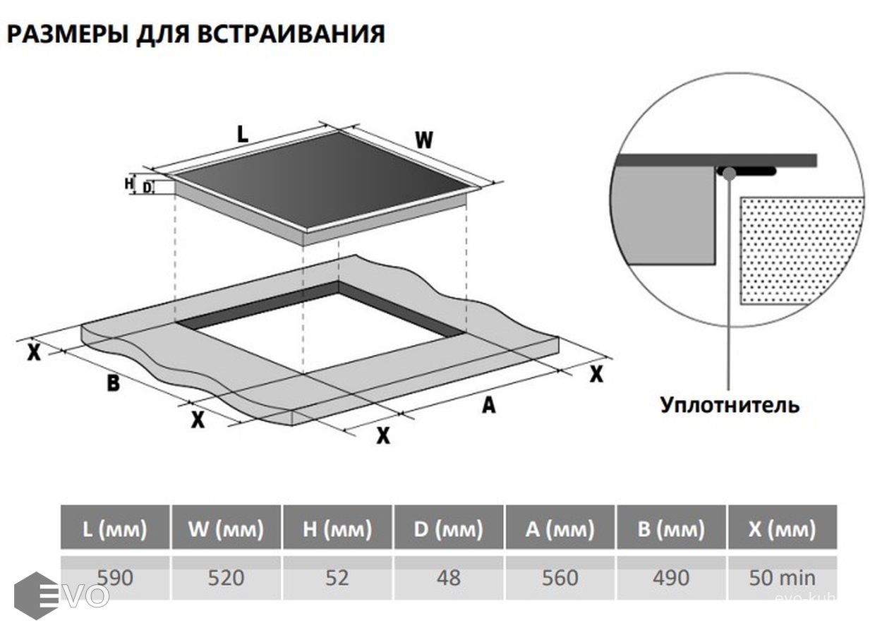 | Размеры встраивания (ВхШхГ), мм: | 48х560х490 |