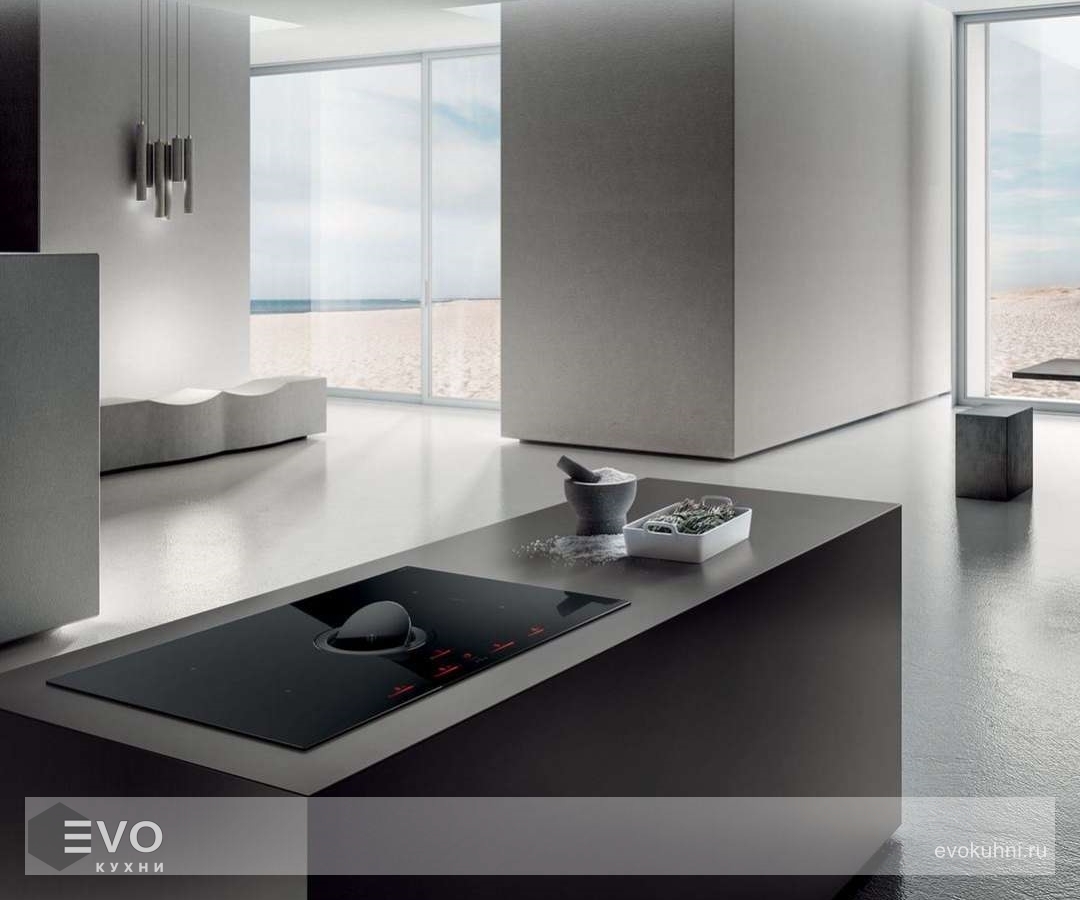 ELICA NIKOLATESLA SWITCH BL/F/83 — индукционная варочная панель в изысканном черном цвете без стыков и выступающих элементов. Зона забора воздуха специально спрятана в кольце из стекла и чугуна.