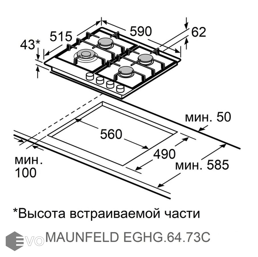 Размеры встраивания (ВхШхГ), мм: 105х590х515 мм
