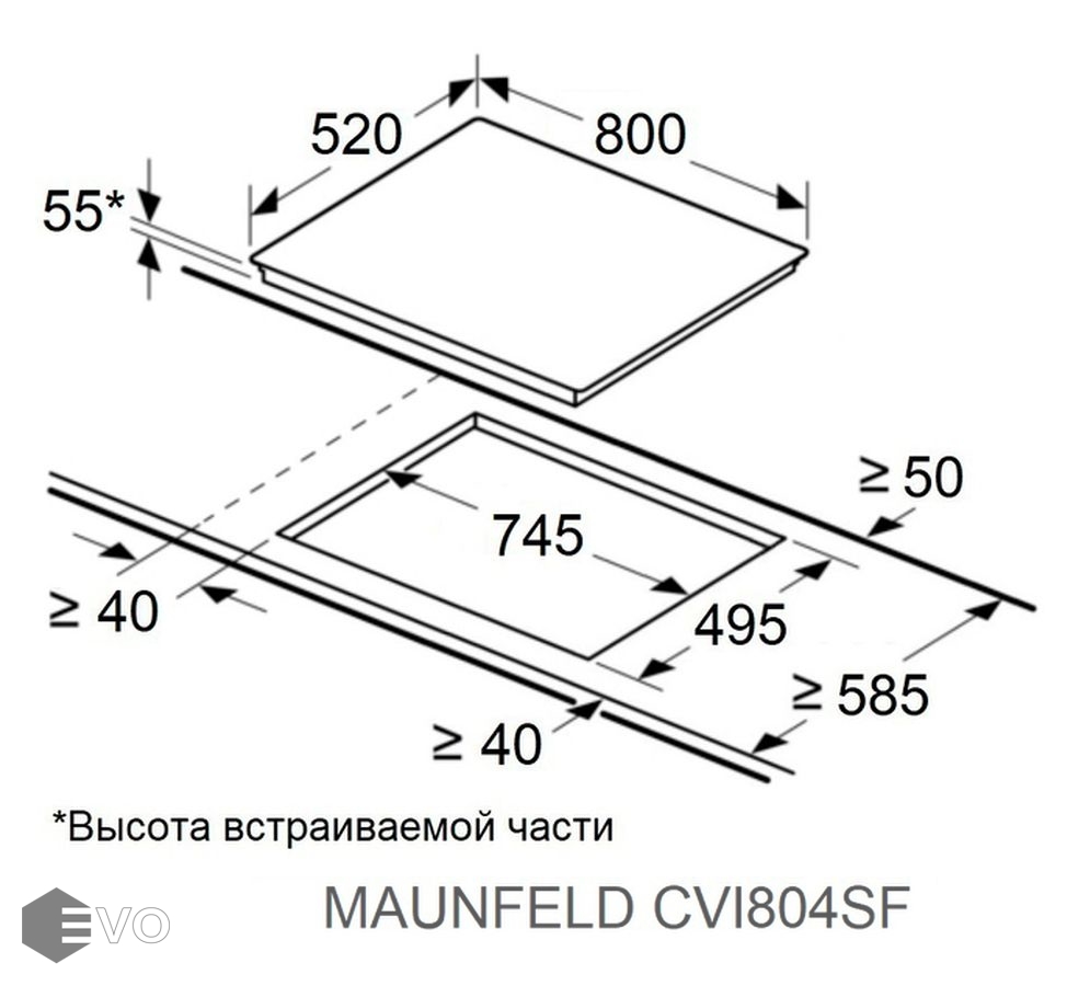 | Размеры встраивания (ВхШхГ), мм: | 55х800х520 мм |