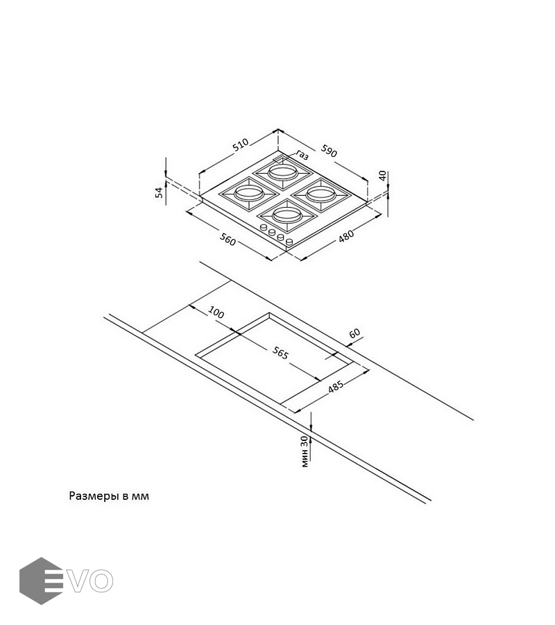 Размеры встраивания (ВхШхГ), мм: 30x565x485