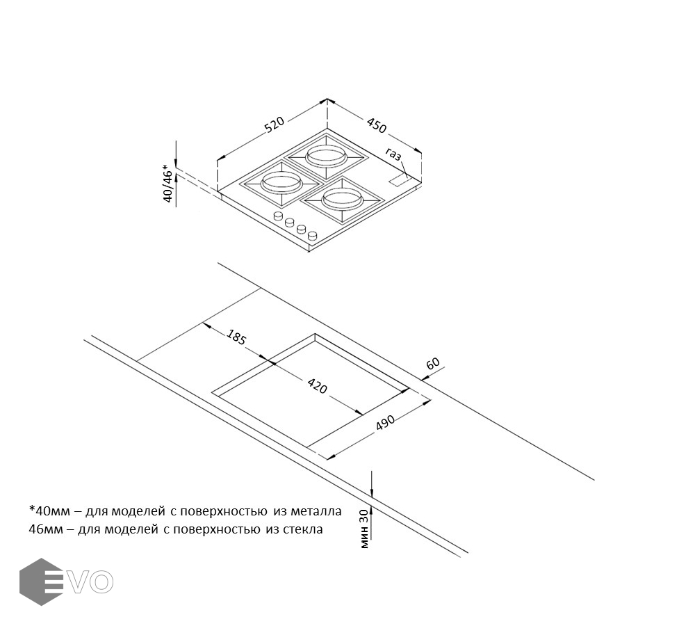 Размеры встраивания (ВхШхГ), мм: | 30x420х490 |