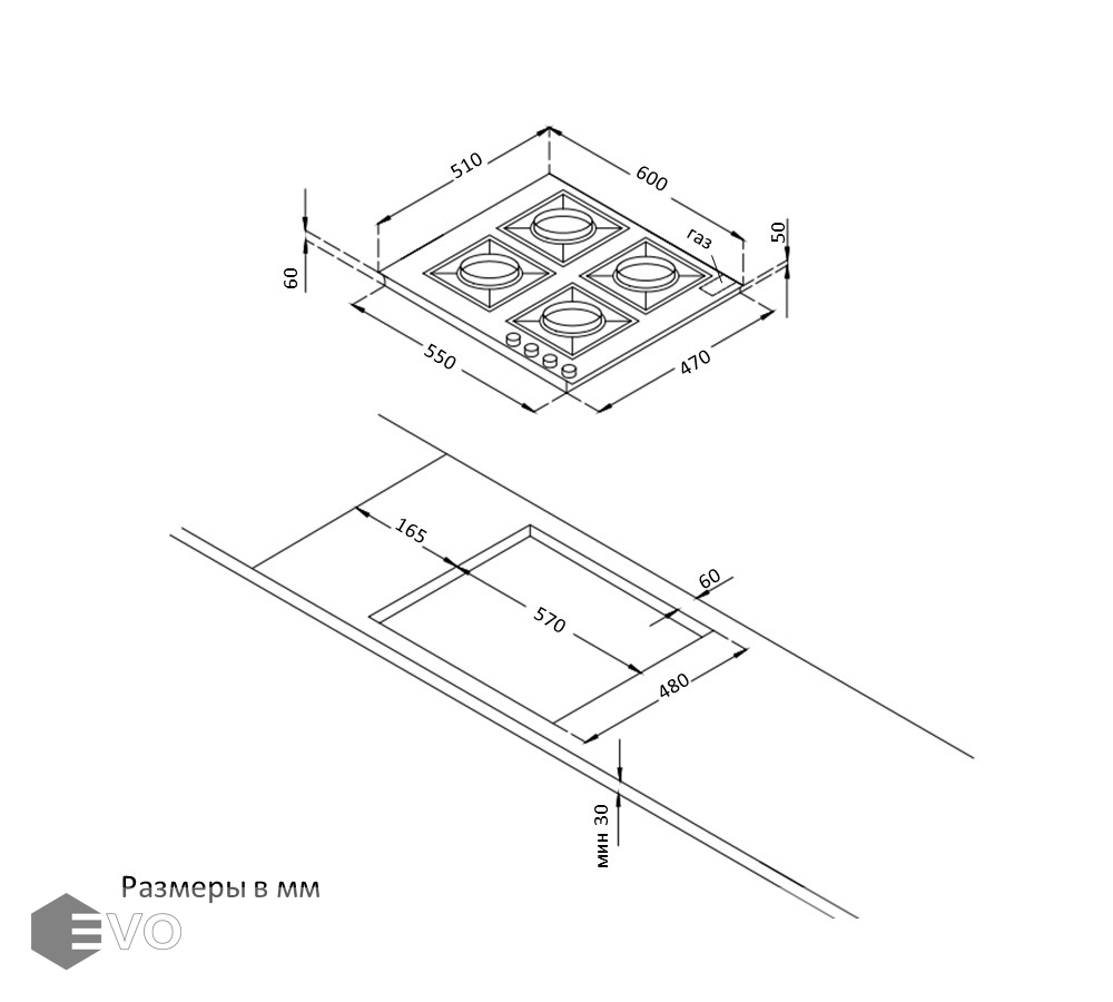 Размеры встраивания (ВхШхГ), мм: | 30x570х480 |