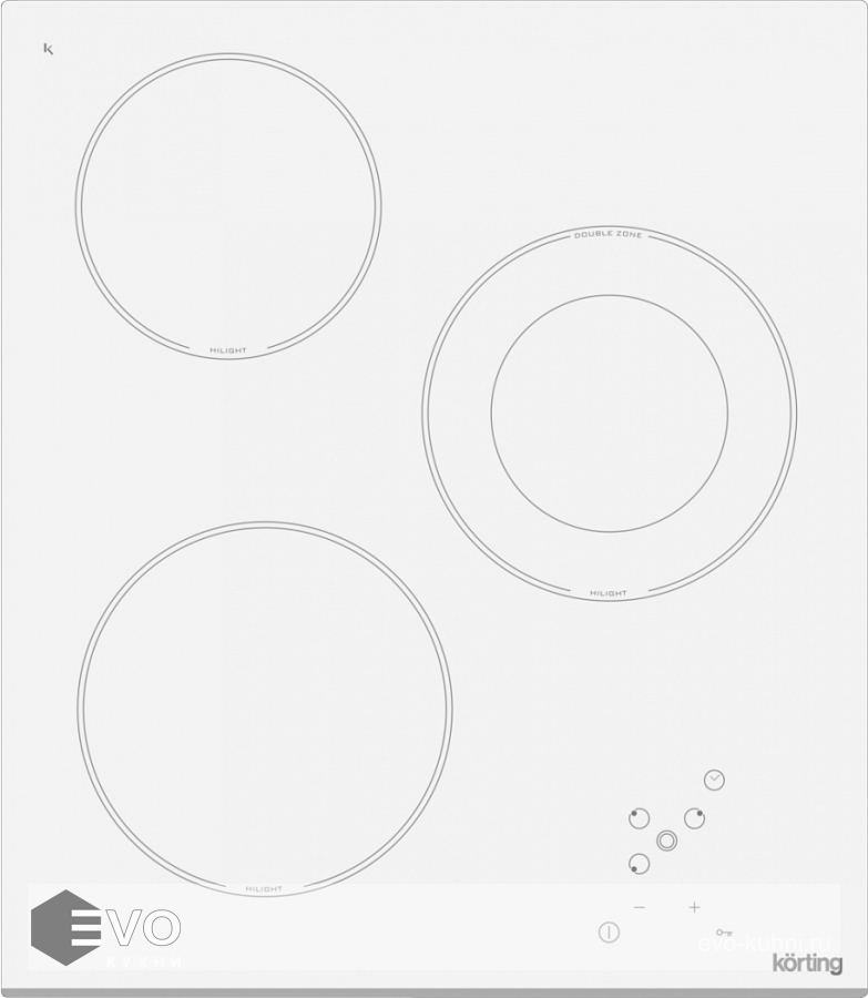 Электрическая HiLight варочная панель Korting HK 42031 BW — в этих конфорках в качестве нагревательного элемента применяется уложенная змейкой лента из высокоомного сплава, конфорка Hilight достигает установленной рабочей температуры буквально за считанные секунды, позволяет плавно регулировать мощность, излучаемое тепло очень равномерно распределяется по всей рабочей зоне.