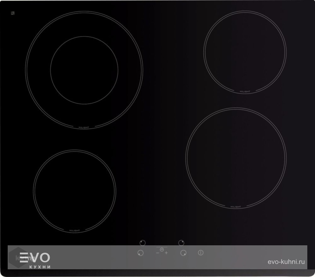 Функции: Таймер конфорок Блокировка панели управления Защитное отключение конфорок Индикатор остаточного тепла Контурная конфорка