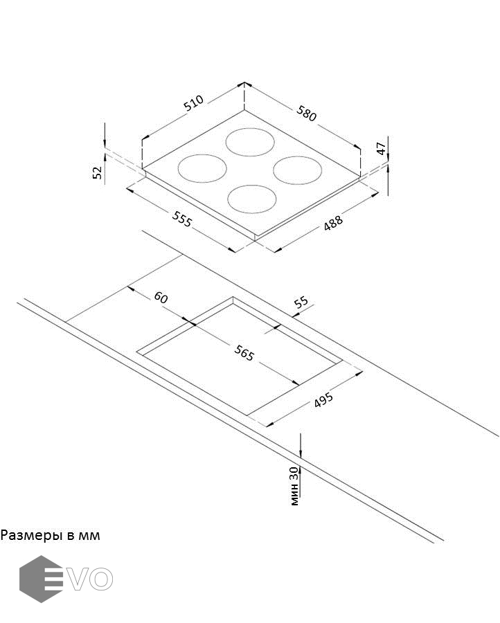 • Правая ближняя конфорка, диаметр/кВт: 180/1.8