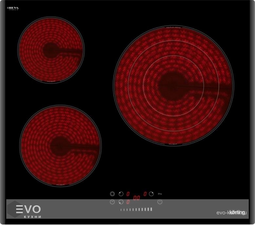 Электрическая HiLight варочная панель Korting HK 6351 B3 — в этих конфорках в качестве нагревательного элемента применяется HiLight. Панель выполнена из стеклокерамики черного цвета и управляется при помощи сенсорной панели Slider Touch Control. Отличительной особенностью модели является наличие 3 конфорок, правая из которых — это круглая тройная зона расширения. Световой индикатор горит, пока температура соответствующего нагревательного поля не понизится до 60°С, тем самым оповещая об уровне остаточного тепла.