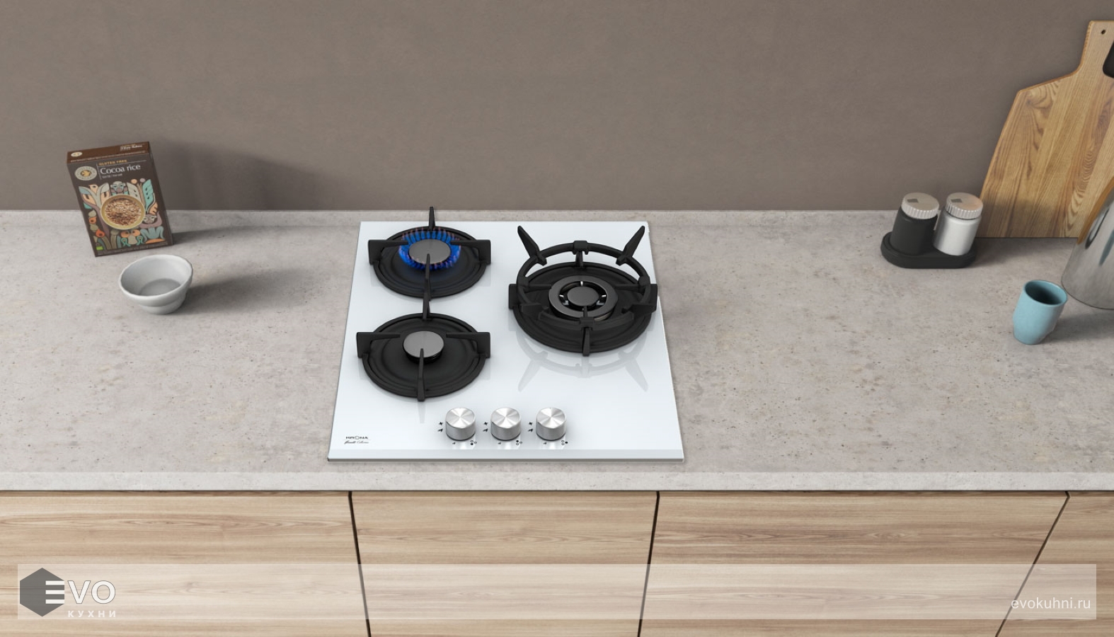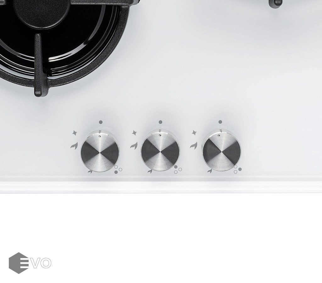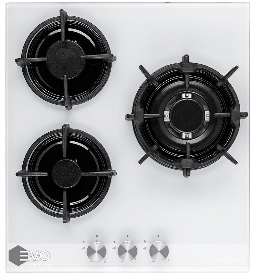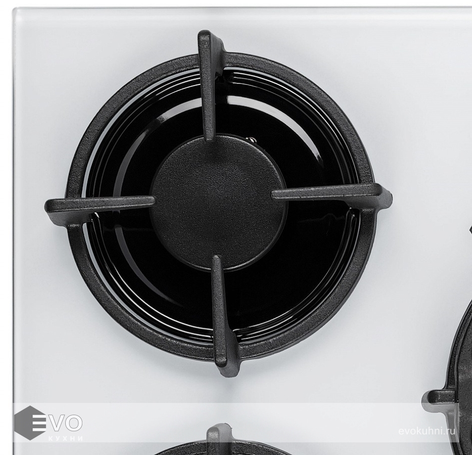 Газовая варочная поверхность KRONA FIERO 45 WH – газовая варочная поверхность выполнена из толстого закаленного стекла толщиной 8 мм, что гарантирует безопасность эксплуатации. В модели предусмотрена функция газ-контроля, автоматический электроподжиг и экспресс-конфорка с тройным пламенем. Приятным дополнением является адаптер для посуды со сферическим дном, который входит в комплект поставки. Поток газа к конфоркам (мощность конфорок) регулируется ручками управления газовыми конфорками, которые, в свою очередь, управляют кранами.