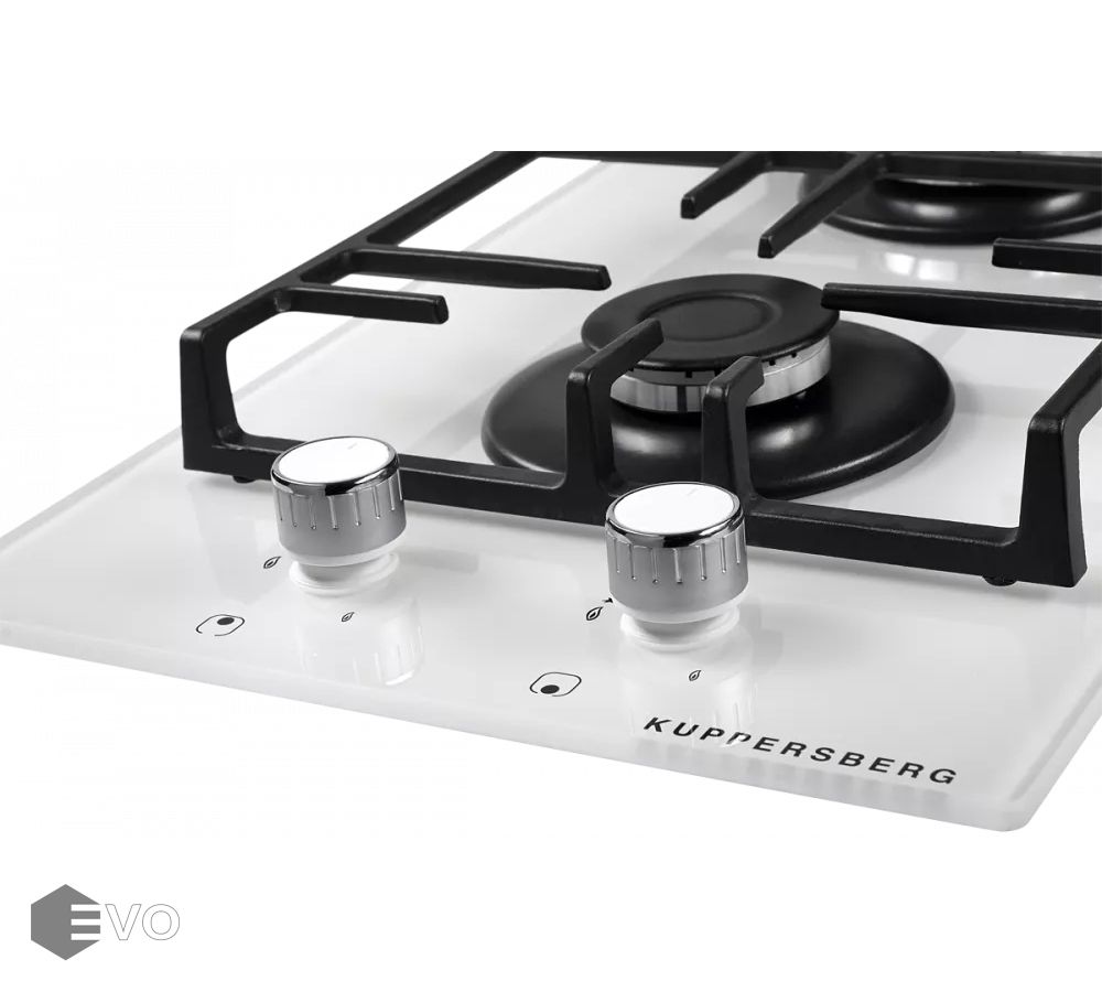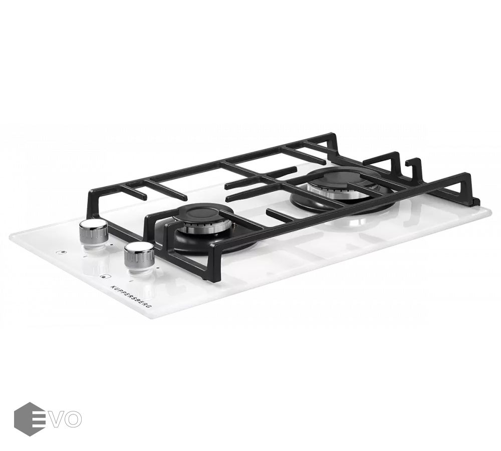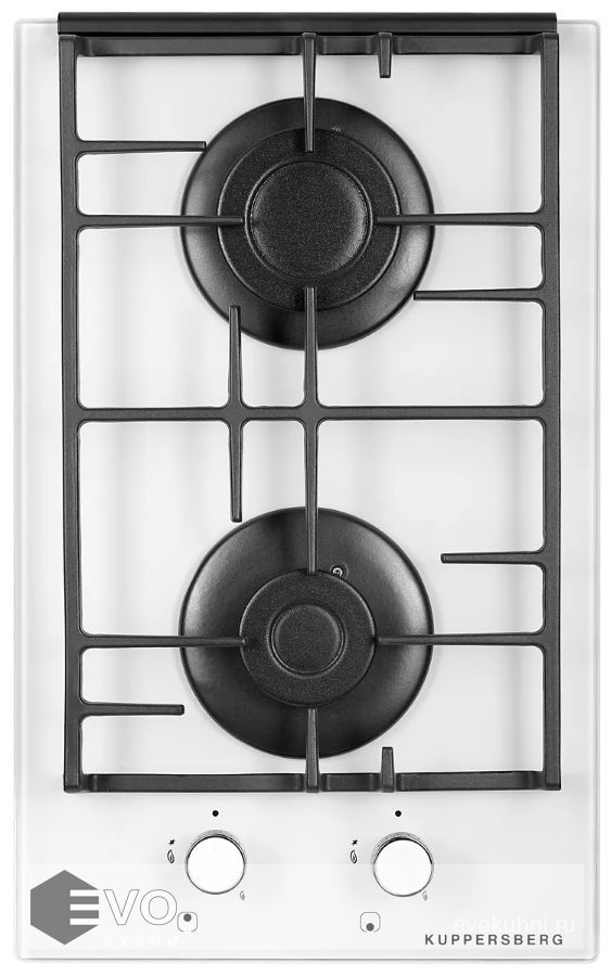 Газовая варочная поверхность, закаленное стекло, ширина 30 см, 2 газовые конфорки, 1 конфорка повышенной мощности, автоподжиг, газ-контроль, чугунные решетки, цвет белый.