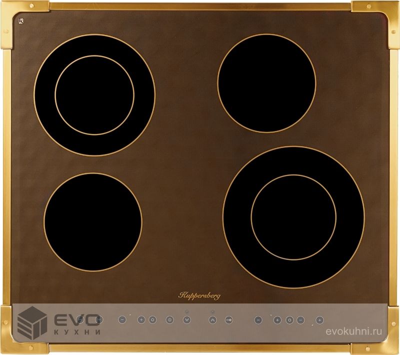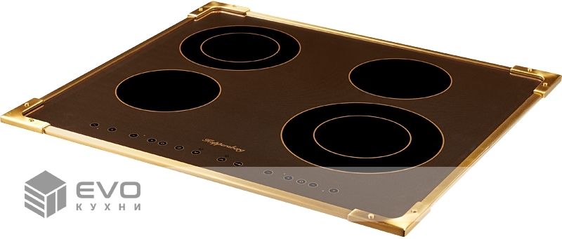 Электрич. независимая варочная поверхность стеклокерамическая, ширина 58 см, 4 зоны ускоренного нагрева HI-Light, 2 зоны с двойным расширением, сенсорное управление, 9 уровней мощности, программирование времени приготовления, автоматика закипания, автоотключение, защита от детей, индикаторы остаточного тепла, цвет текстурная бронза, рамка цвета бронзы