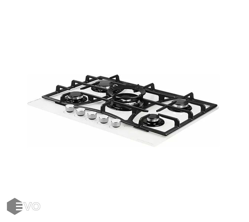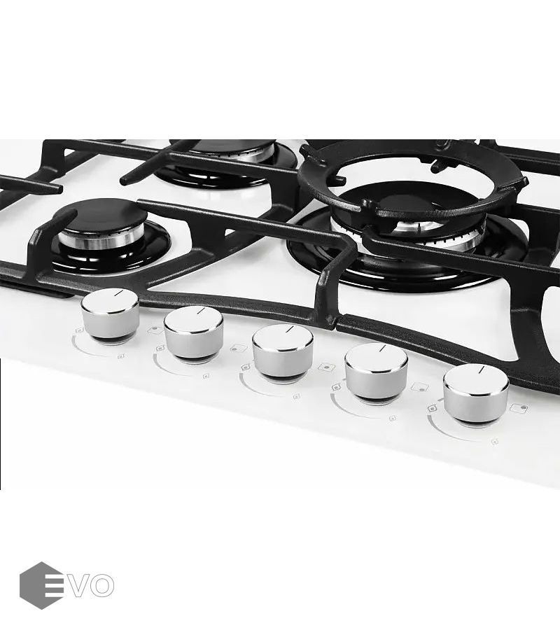 Газовая варочная поверхность, закаленное стекло, ширина 70 см, 5 газовых конфорок, WOK конфорка(3,8 кВт), автоподжиг, газ-контроль, чугунные решетки, цвет белый. Варочная поверхность из закаленного стекла, имеет высокую прочность и срок службы, также гарантирует легкую очистку от грязи и продуктов кипения. Внешний вид закаленного стекла подчеркнет столешницу из любых материалов и идеально впишется в вашу кухню. Решетка изготовлена из чугуна с оригинальным дизайном и практичной формой. Фиксацию решетки на варочной панели обеспечивает ребро жесткости, за счет специальных креплений.